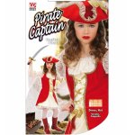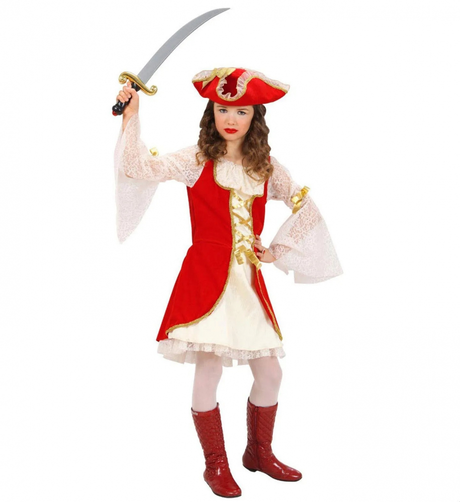 Costumul Capitan Pirat include rochia cu detalii din dantela, fundite aurii aplicate si palaria asortata.