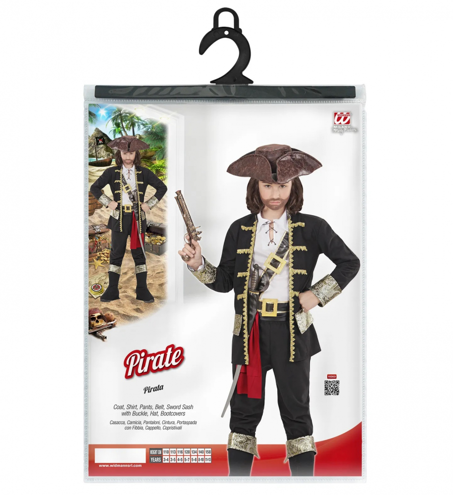 Costum Capitan Pirat Copii include bluza, jacheta, pantalonii, centura, suportul pentru sabie, acoperitoarele pentru incaltaminte si palaria.