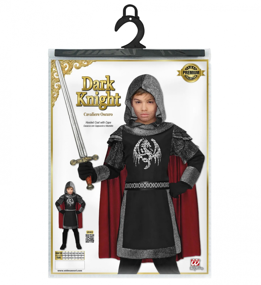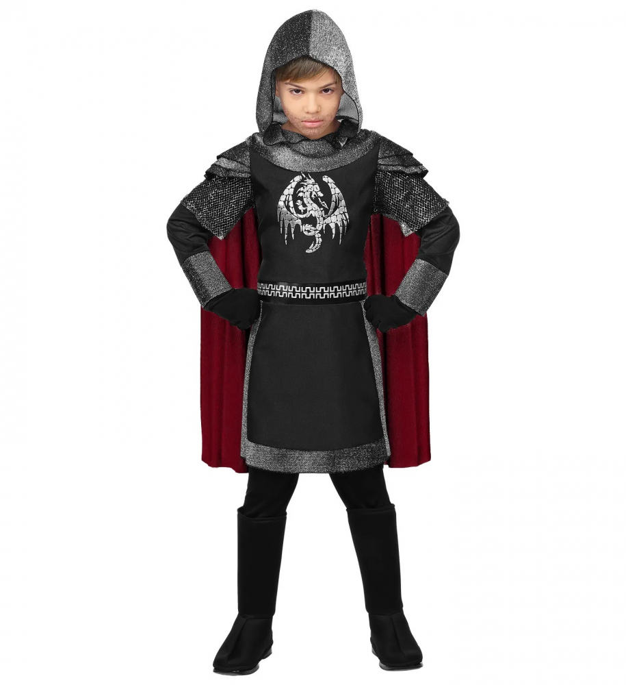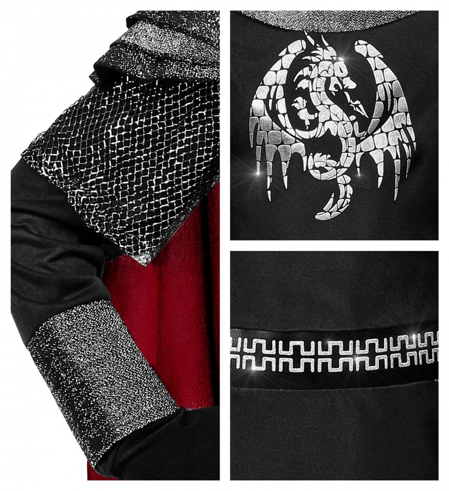 Costum Cavaler Premium pentru copii include tunica cu gluga aplicata si pelerina.