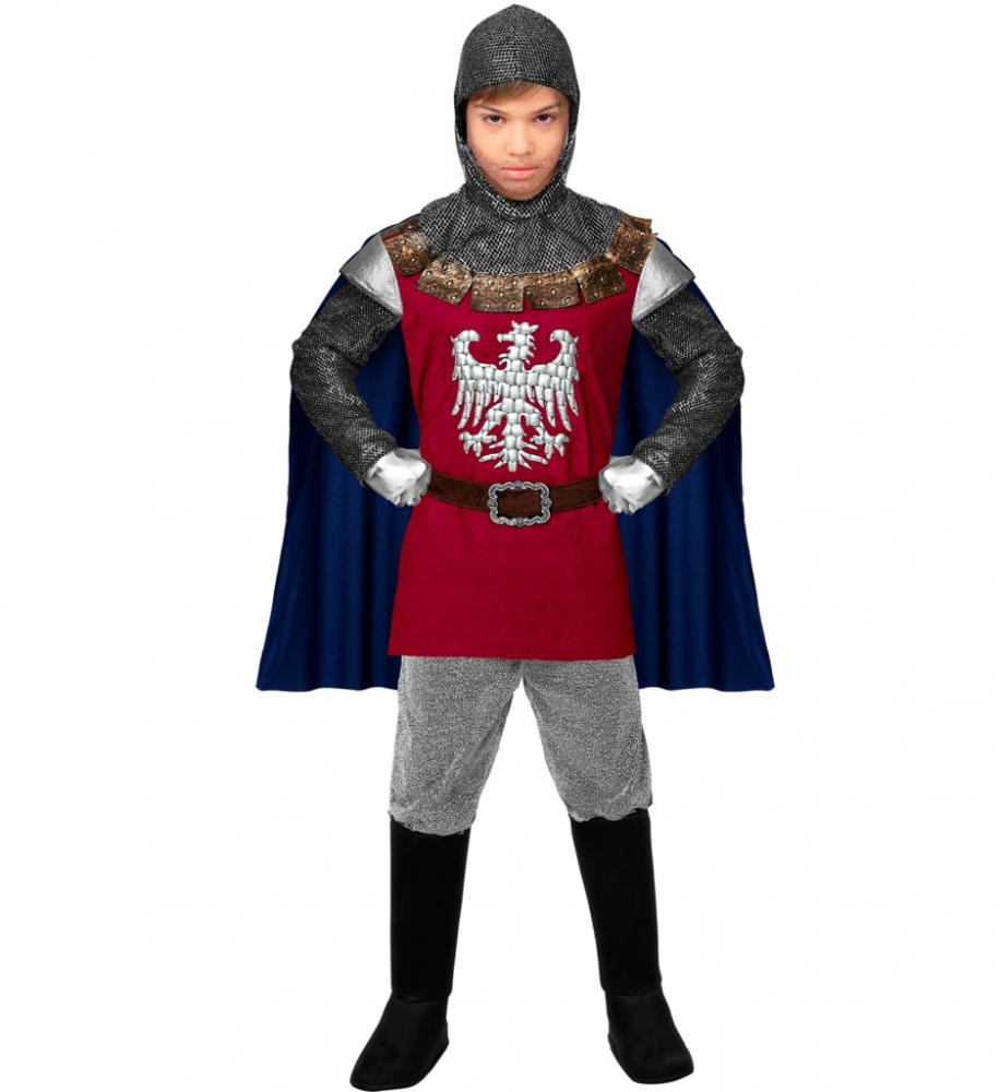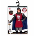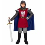 Costumul Cavaler Rosu include bluza cu pelerina atasata, cagula si centura.
