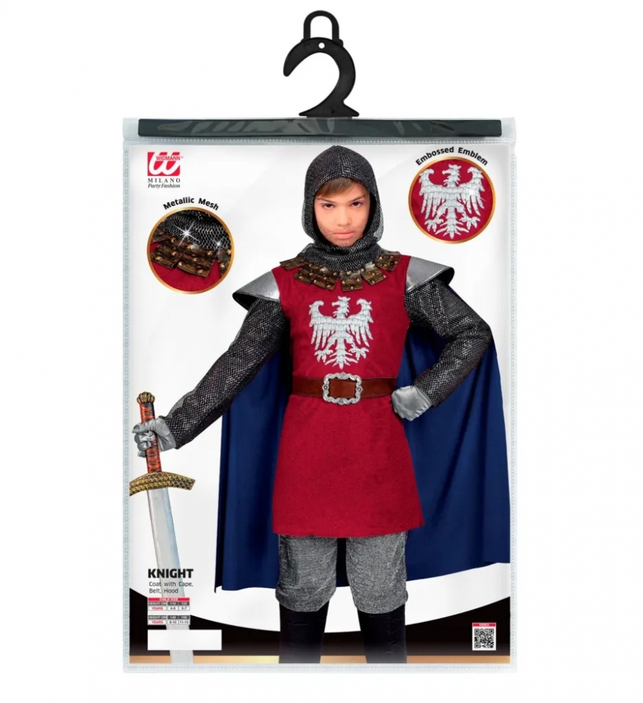 Costumul Cavaler Rosu include bluza cu pelerina atasata, cagula si centura.