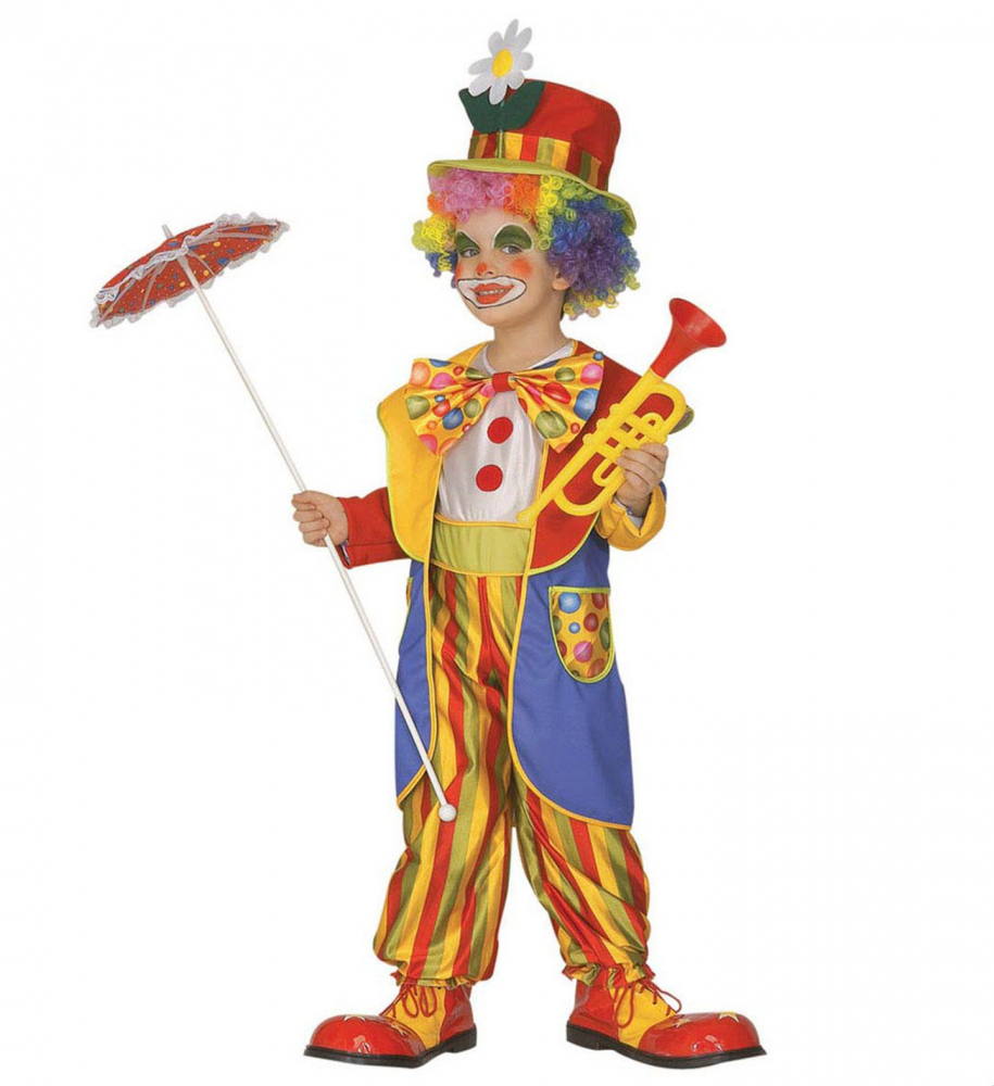 Costumul de clown include salopeta, sacoul, papionul si palaria.