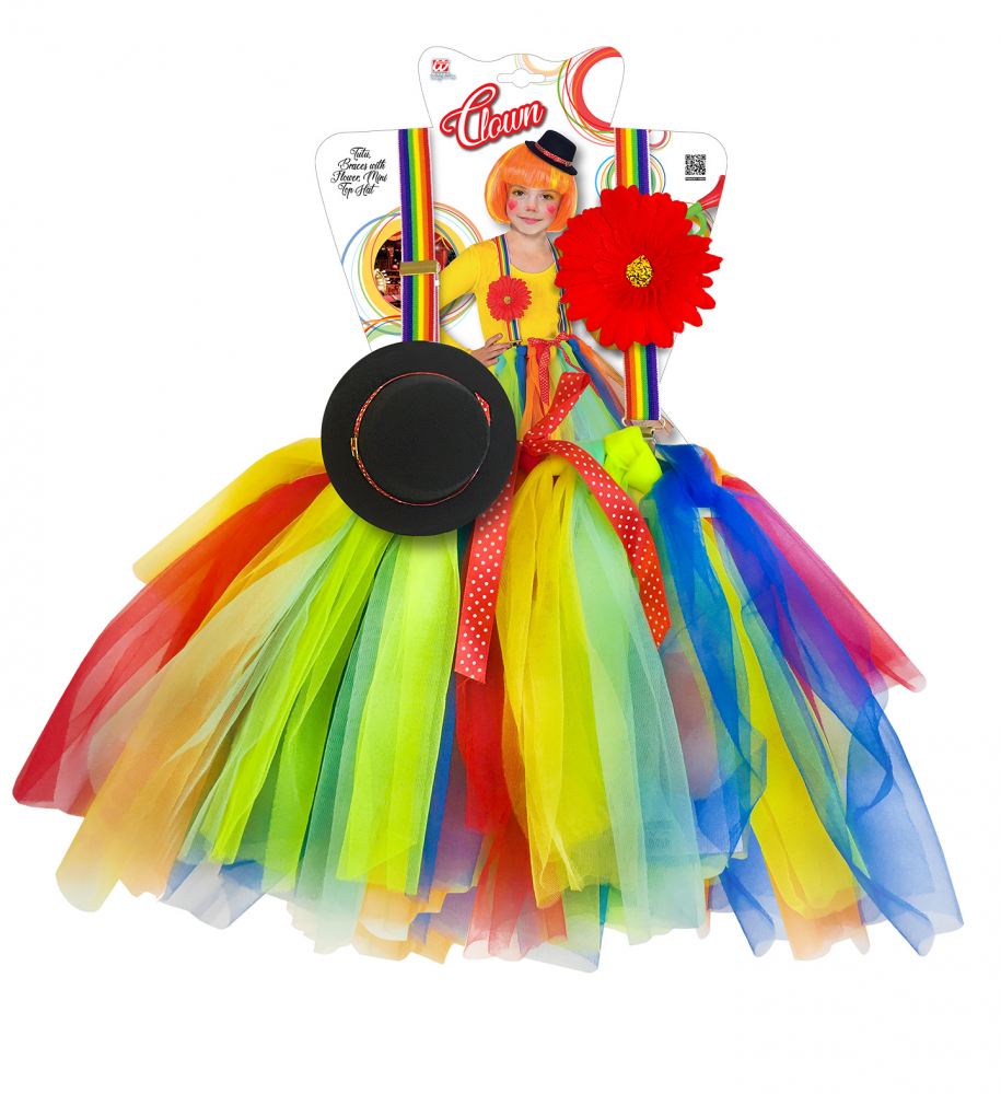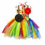 Costum Clown 4 Piese 4-5 Ani include fustita colorata din tul cu fundita rosie din satin, bretelele multicolore, floarea cu clama si mini palariuta. Costumul Clown pentru copii este disponibil pentru fetitele de 4-5 ani (116 cm inaltime).