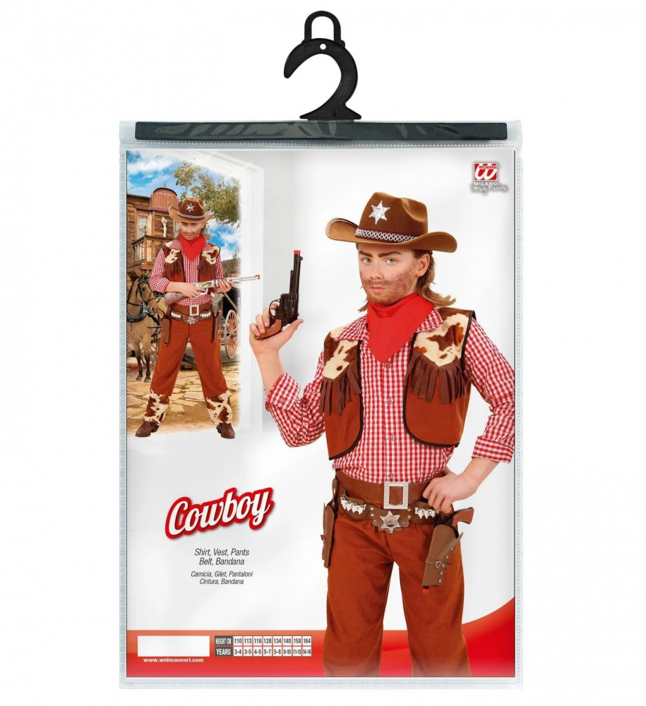 Costumul de cowboy contine camasa, pantalonii, vesta, centura si esarfa.