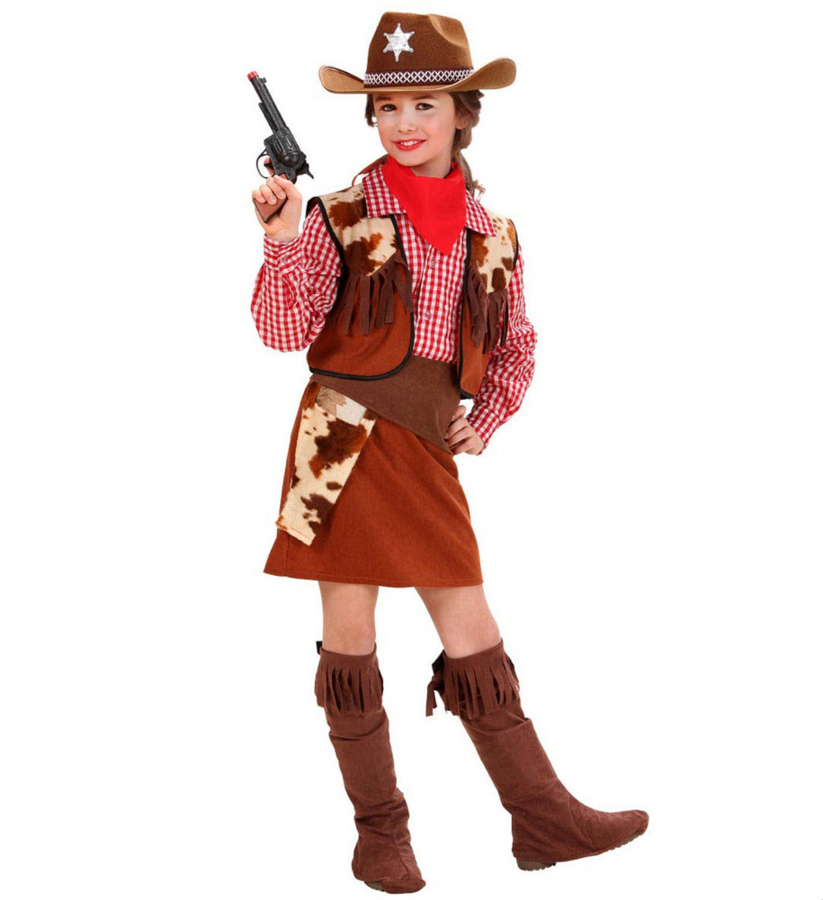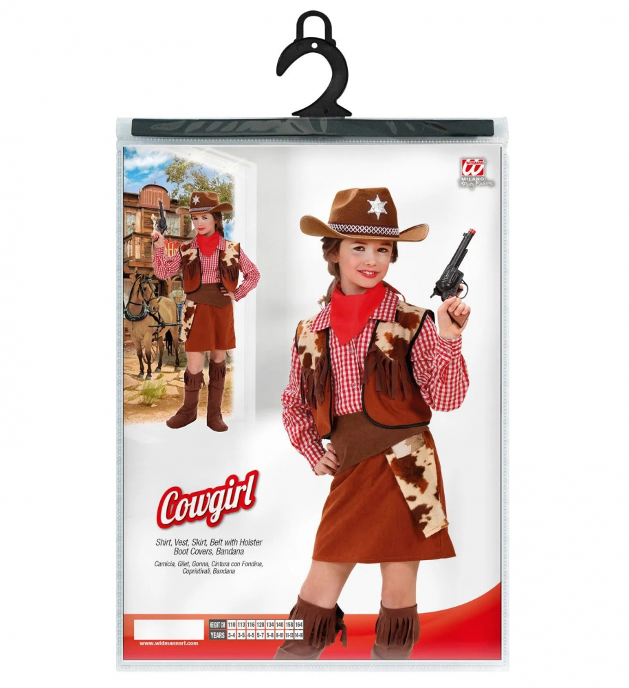 Costumul Cowgirl include camasa, vesta, fusta, centura cu suport pentru pistol, acoperitoarele pentru incaltaminte si bandana.