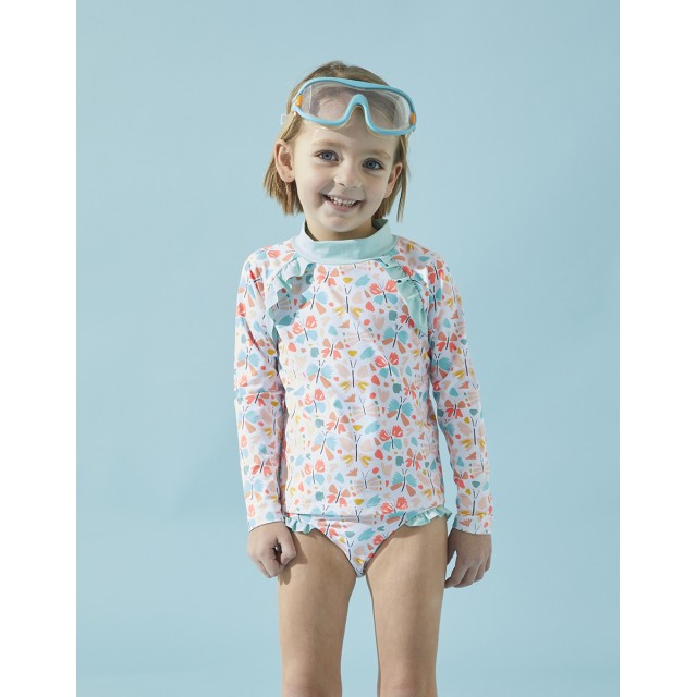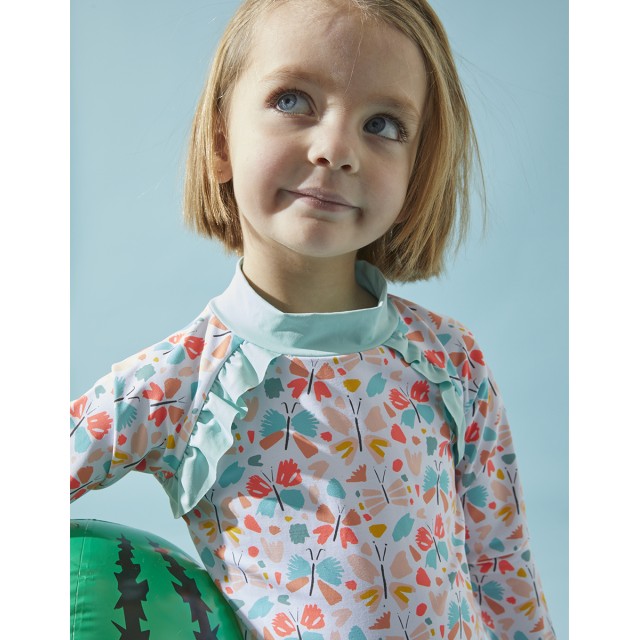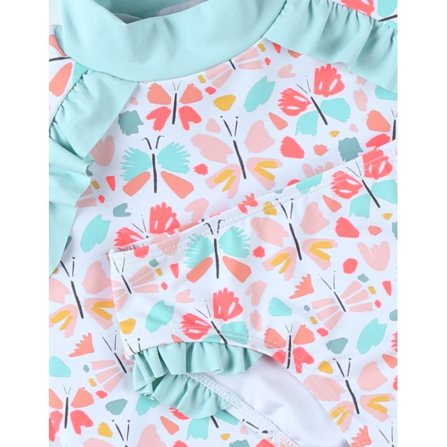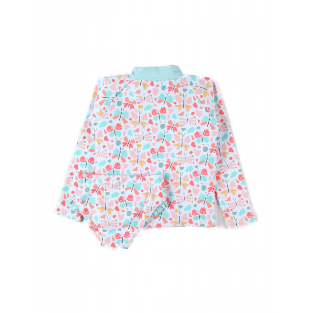 Setul de protectie UV coral si aqua imprimat cu fluturi alcatuit dintr-un top cu maneca lunga si chilotei de inot iti va proteja copilul de razele solare (UVA si UVB solare).