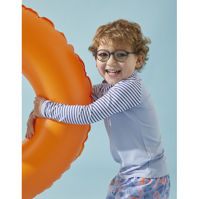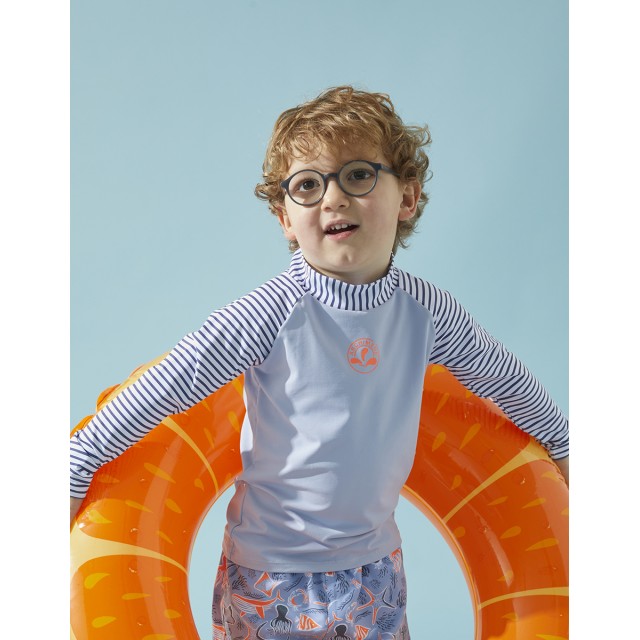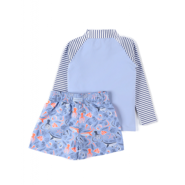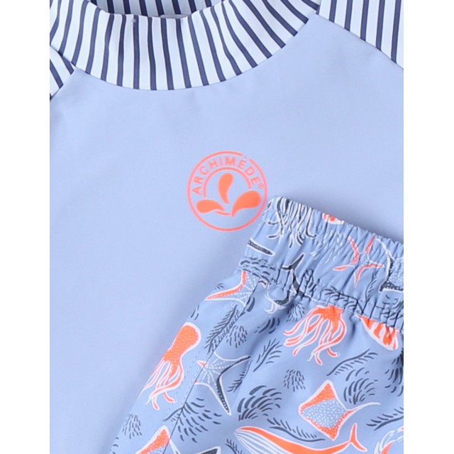 Setul de protectie UV albastru deschis imprimat cu animale de mare alcatuit dintr-un top cu maneca lunga si pantaloni scurti de inot iti va proteja copilul de razele solare (UVA si UVB solare).