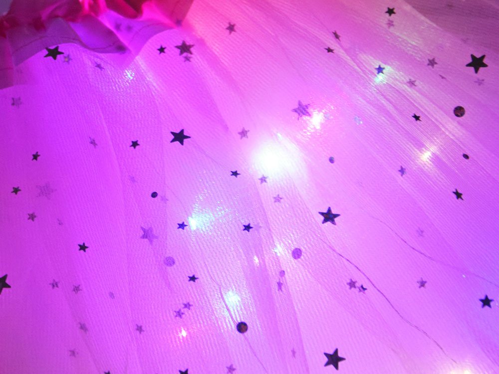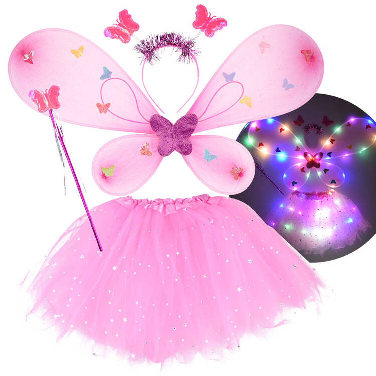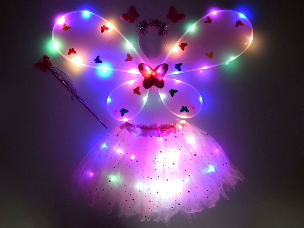 Atat fustita din tul, cat si aripile sunt echipate cu lumini LED care vor face ca micuta zana sa iasa in evidenta si sa straluceasca la orice eveniment.