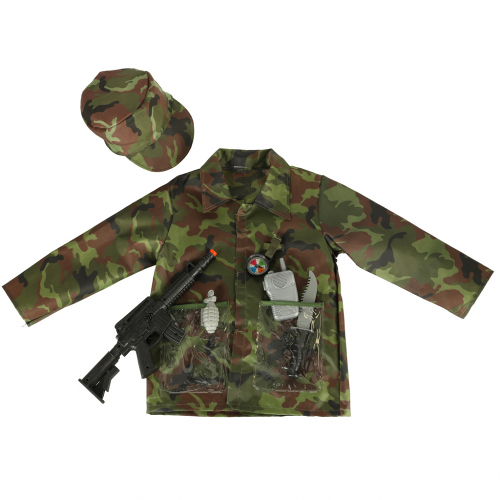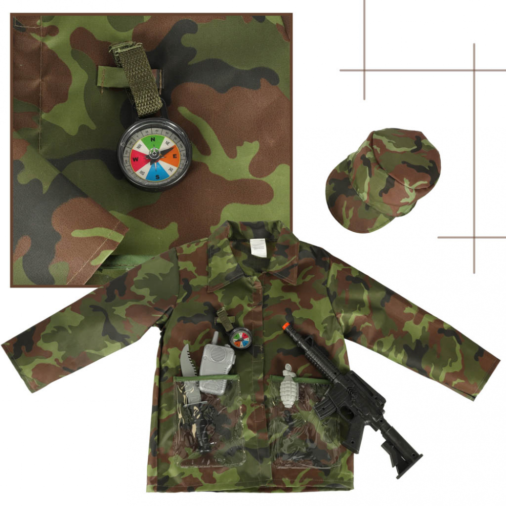 Setul oferit include nu numai un costum, ci si o multime de accesorii! Printre ele veti gasi o pusca, o busola, un binoclu, un walkie-talkie, o grenada si un cutit! Echipamentul adecvat este baza eficientei unui soldat!