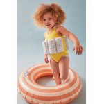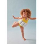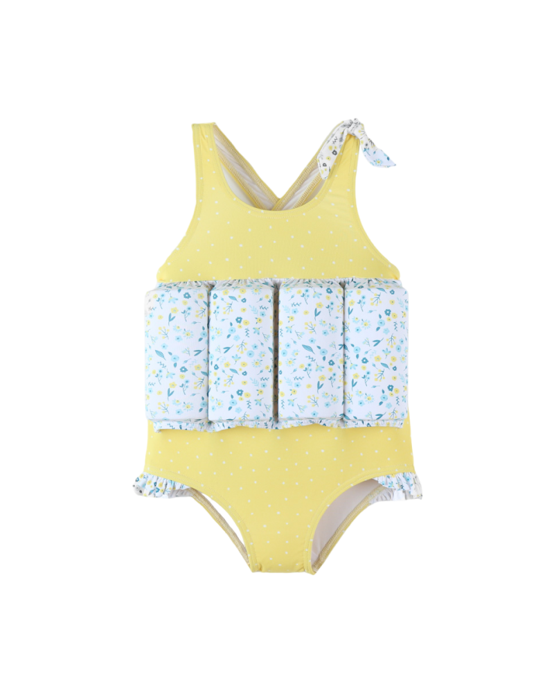 Costumul plutitor galben deschis cu imprimeu floral este special conceput pentru a coordona miscarile bratelor si picioarelor copilului tau in apa.