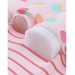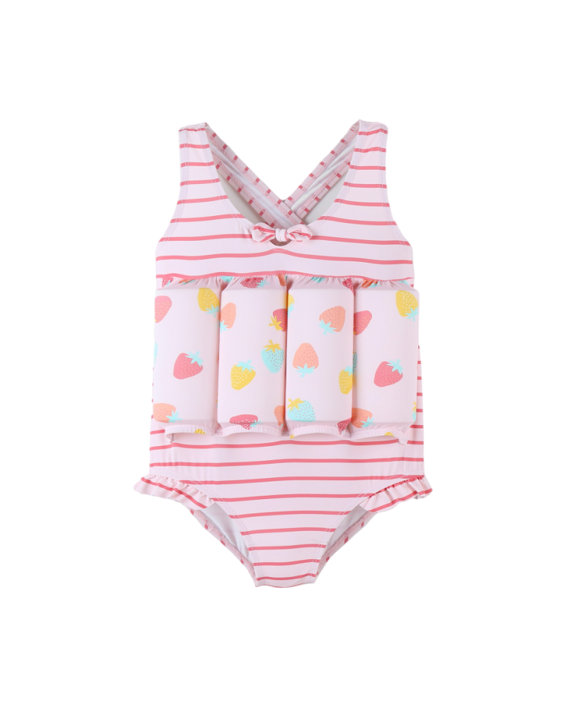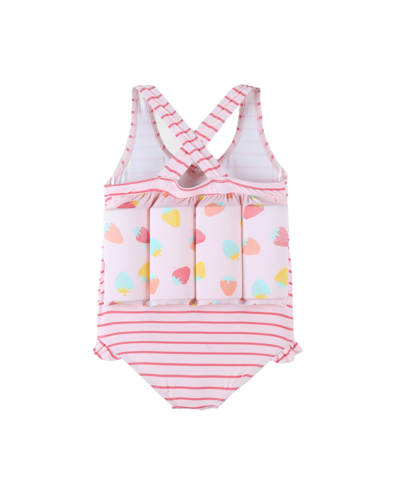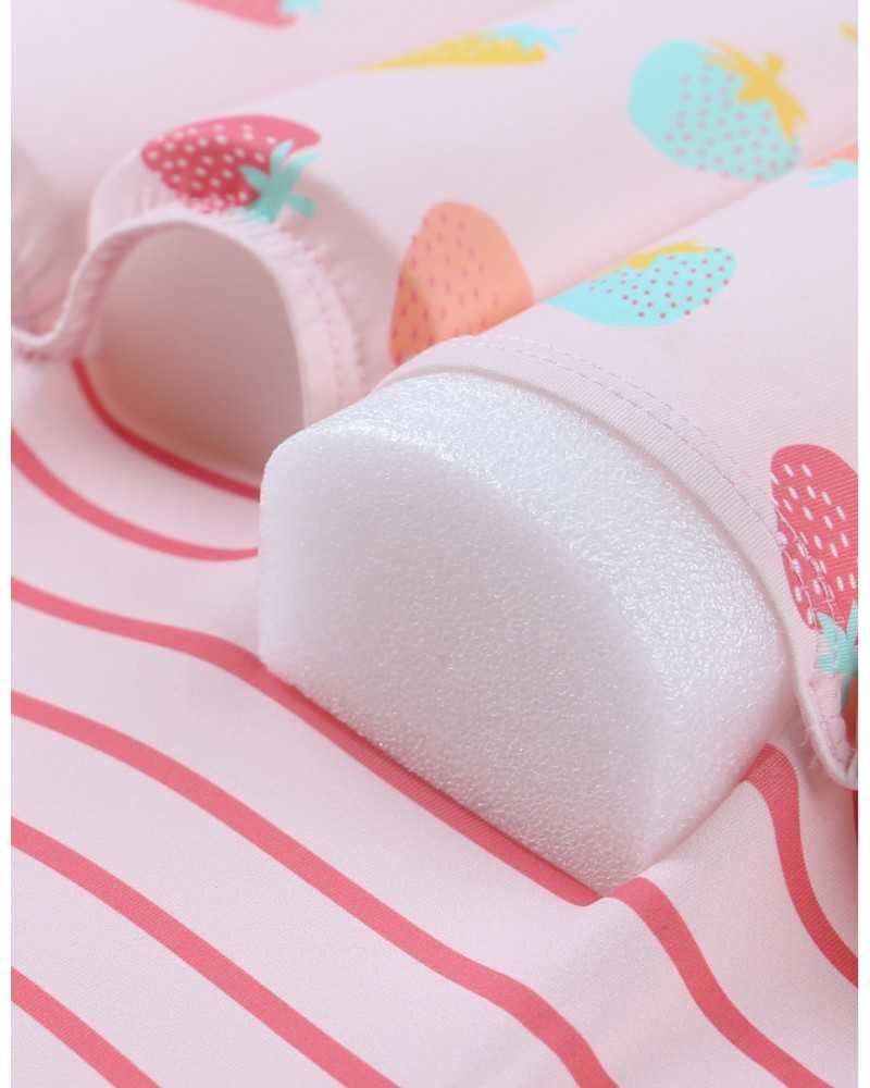 Costumul flotabil cu dungi roz deschis cu imprimeu de capsuni este special conceput pentru a coordona miscarile bratelor si picioarelor copilului in apa.