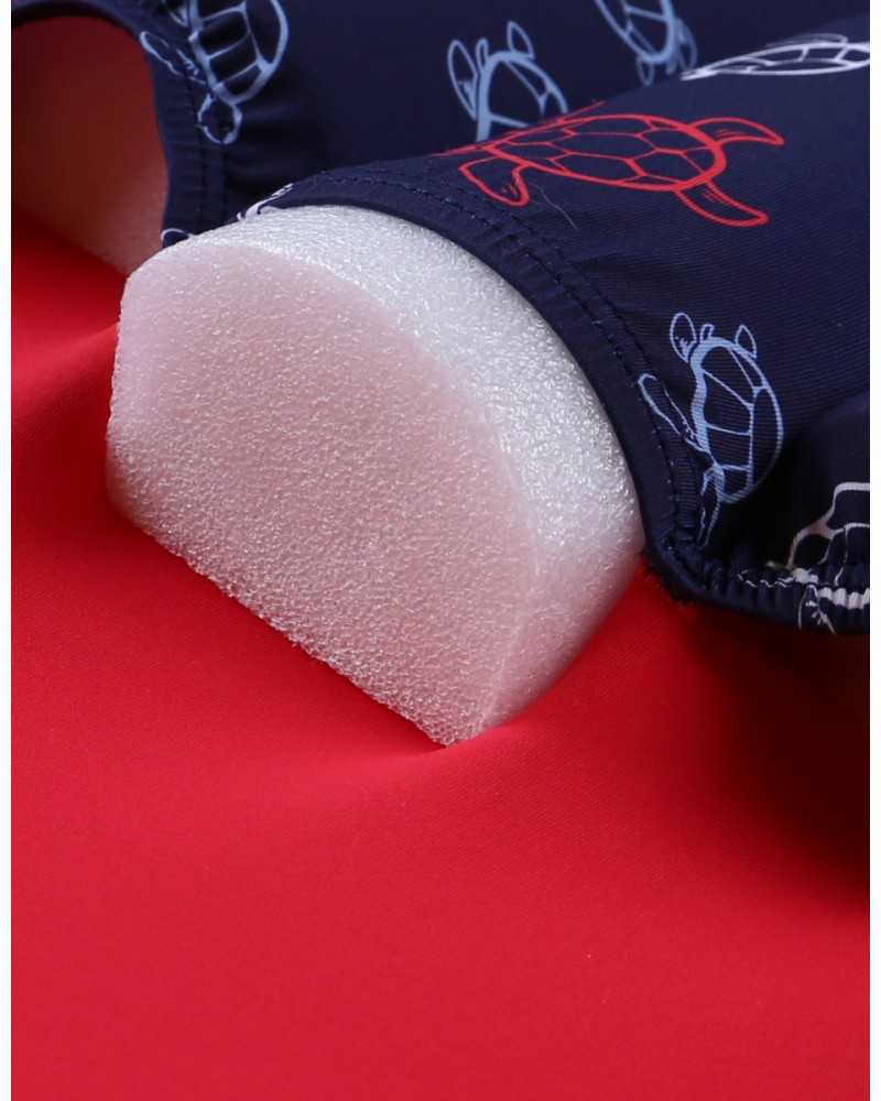 Costumul flotabil bleumarin si rosu cu imprimeu cu broasca testoasa este special conceput pentru a coordona miscarile bratelor si picioarelor copilului tau in apa.