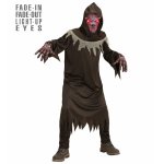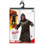 Costum Demon Halloween include roba neagra, manusile imprimate si masca cu gluga, ce are led-uri in zona ochilor ce se aprind intermitent.
