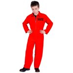 Costumul Detinut Copii include salopeta rosie inscriptionata.
