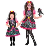 Costumul Dia De Los Muertos Fetite Multicolor include rochia model schelet colorata si bentita cu voal.