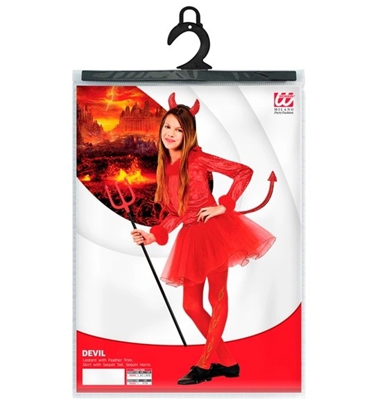 Costumul Dracusor Fete include bluza cu maneca lunga si puf rosu la baza manecilor, fusta din tulle cu codita atasata si bentita cu cornite.