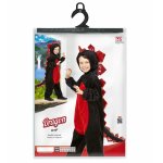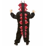 Costum Dragon Negru include salopeta din plus cu gluga aplicata, solzi rosii si coada.