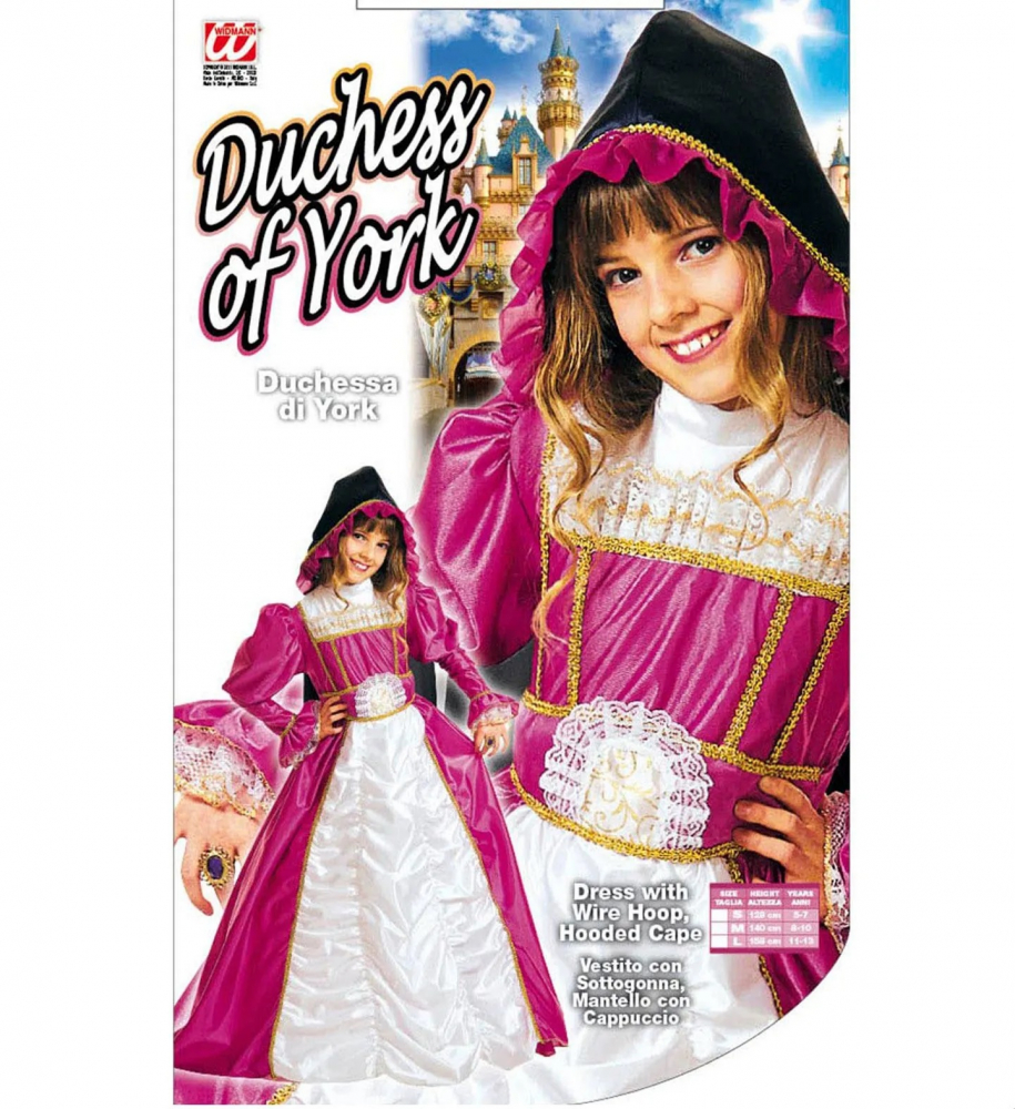 Costumul Ducesa De York include rochia cu crinolina, centura si gluga cu pelerina.