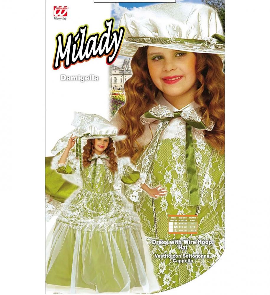 Costumul Milady include rochia cu crinolina si dantela aplicata alaturi de palaria asortata.