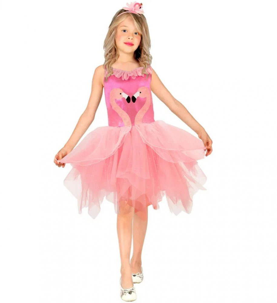 Costumul Flamingo Copii contine rochia roz cu fusta tutu si bentita.