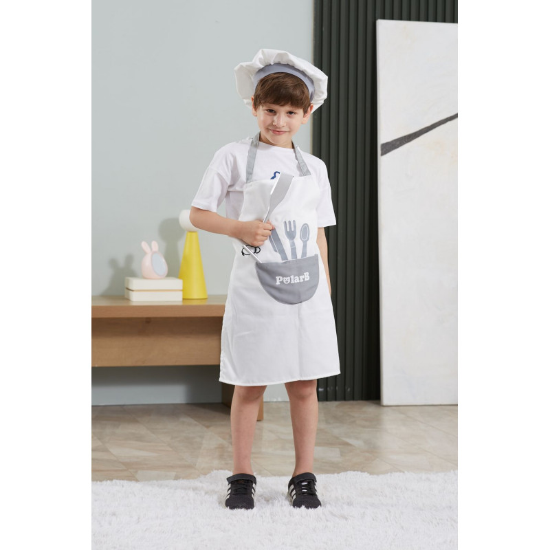 Un set ideal pentru micutii pasionati de gatit! Include un sort si o boneta de bucatar, un set grozav pentru copiii pasionati de gatit sau bricolaj in bucatarie. Sortul este proiectat cu bretea pentru gat si legaturi pentru talie, boneta de bucatar in forma de ciuperca cu velcro in spate, pentru a permite o potrivire mai buna. Vine cu un buzunar util in mijlocul sortului, tinand cu usurinta accesoriile de gatit si copt, pensula si celelalte instrumente. Perfect pentru gatit in bucatarie, cursuri de gatit, cursuri de pictura, petrecere tematica sau joc de rol.