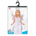 Costum Inger Argintiu Fete include rochia cu maneci scurte transparente, aripile asortate din material si aureola.