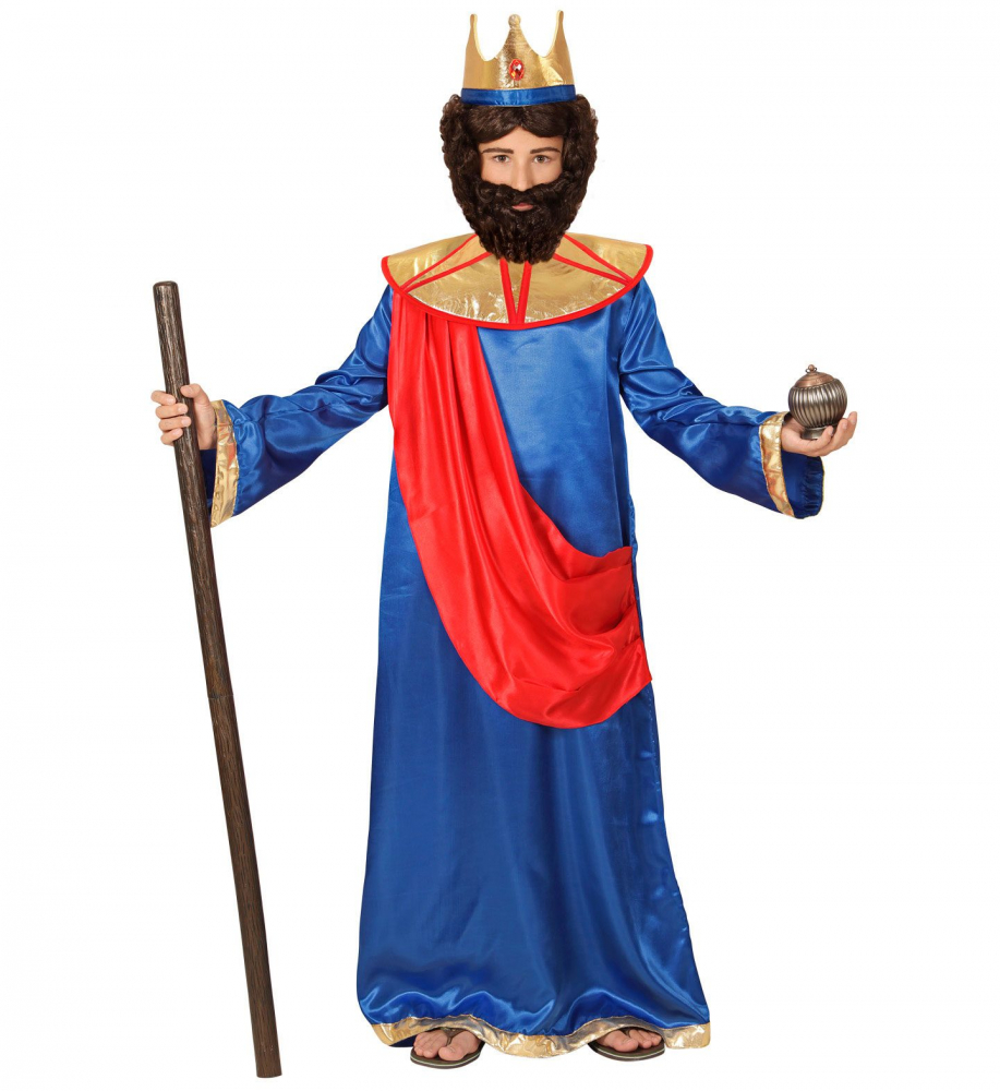 Costum Mag Copil include tunica albastra imitatie satin cu esarfa rosie si guler, alaturi de coroana din material cu pietre aplicate. Costumul este disponibil in 4 categorii de varsta: 4-5 ani (116 cm inaltime), 5-7 cm (128 cm inaltime), 8-10 cm (140 cm inaltime) si 11-13 cm (158 cm inaltime). Daca de sarbatori cel mic are serbare, inseamna ca va trebui sa ii alegi un personaj biblic sau societal in care sa se costumeze. Pentru aceasta noi iti propunem sa lasi deoparte personajele Craciunului si sa patrunzi in lumea magica a povestilor nasterii Domnului. Povesti care te vor face sa zambesti si sa vezi viata cu alti ochi pentru cateva minute, atat pe tine, cat si pe cel mic. De aceea iti propunem costumul de mag pentru serbare, in care cel mic va vesti nasterea lui Iisus. Suntem siguri ca cel mic va arata ca un personaj biblic! Costumul il va asorta pe cel mic cu cerul si zapada.
