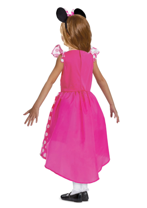 Costum Minnie Roz Disney contine rochia cu buline aplicate, avand model mai lung in partea din spate, camee cu imaginea personajului si bentita cu urechi.
