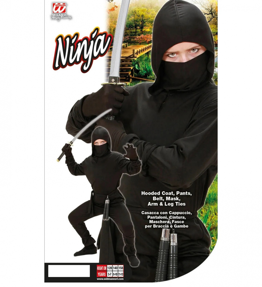 Costumul ninja include bluza, pantalonii, masca, gluga, centura si accesoriile tip cordon pentru maini si picioare.