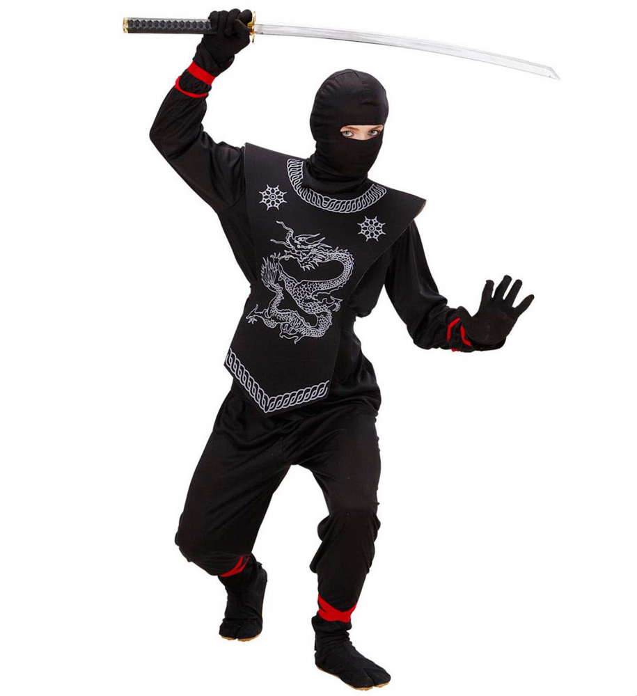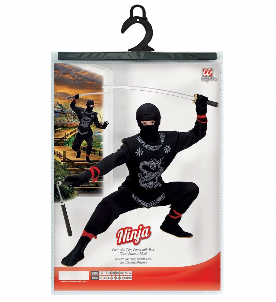 Costumul de ninja include bluza, armura pentru piept din burete, pantalonii, gluga si masca.