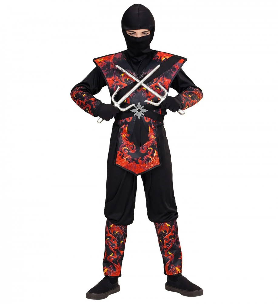 Costum Ninja Dragon include salopeta cu armura din burete imprimata model flacari si cagula specifica.