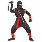 Costum Ninja Luptator Copil include pantalonii, bluza cu gluga si detalii aurii, centura rosie si masca.