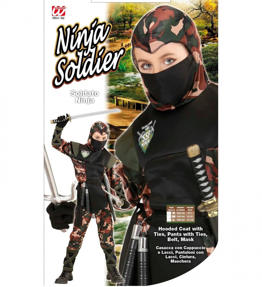 Costumul de soldat ninja include bluza, pantalonii, gluga, centura si masca.