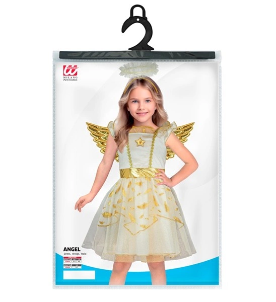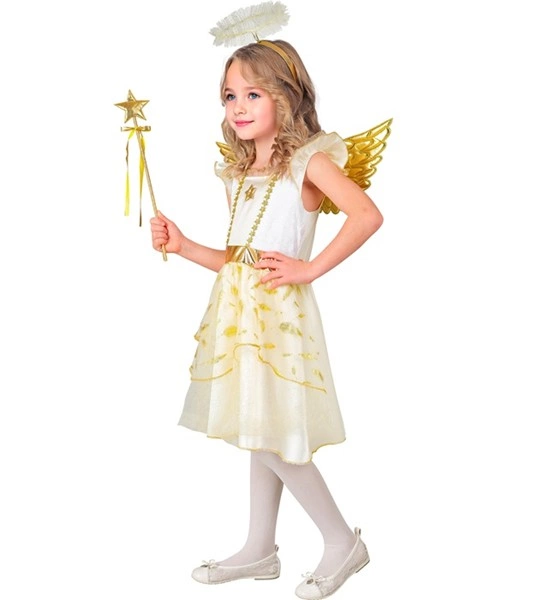 Costum Inger Auriu Fetite include rochita, aripile aurii si bentita cu aureola.