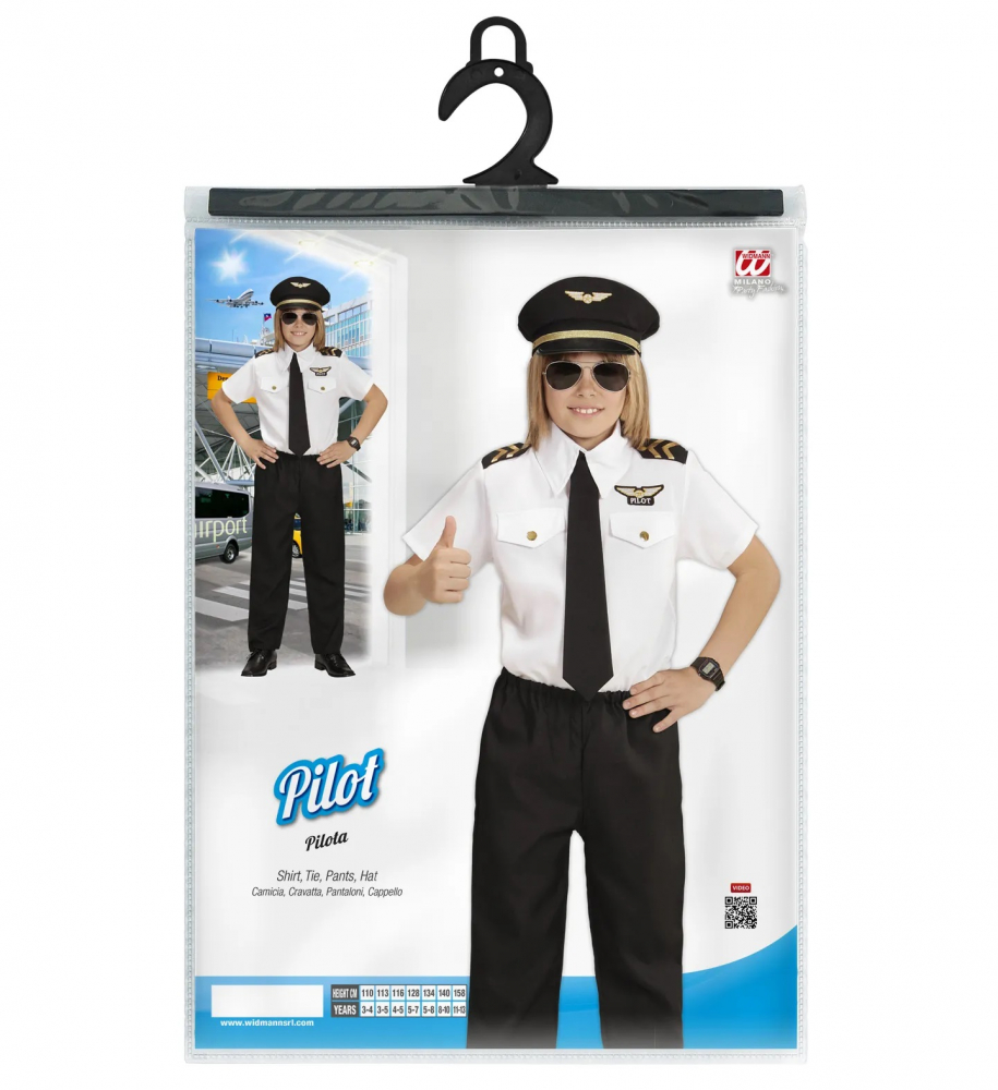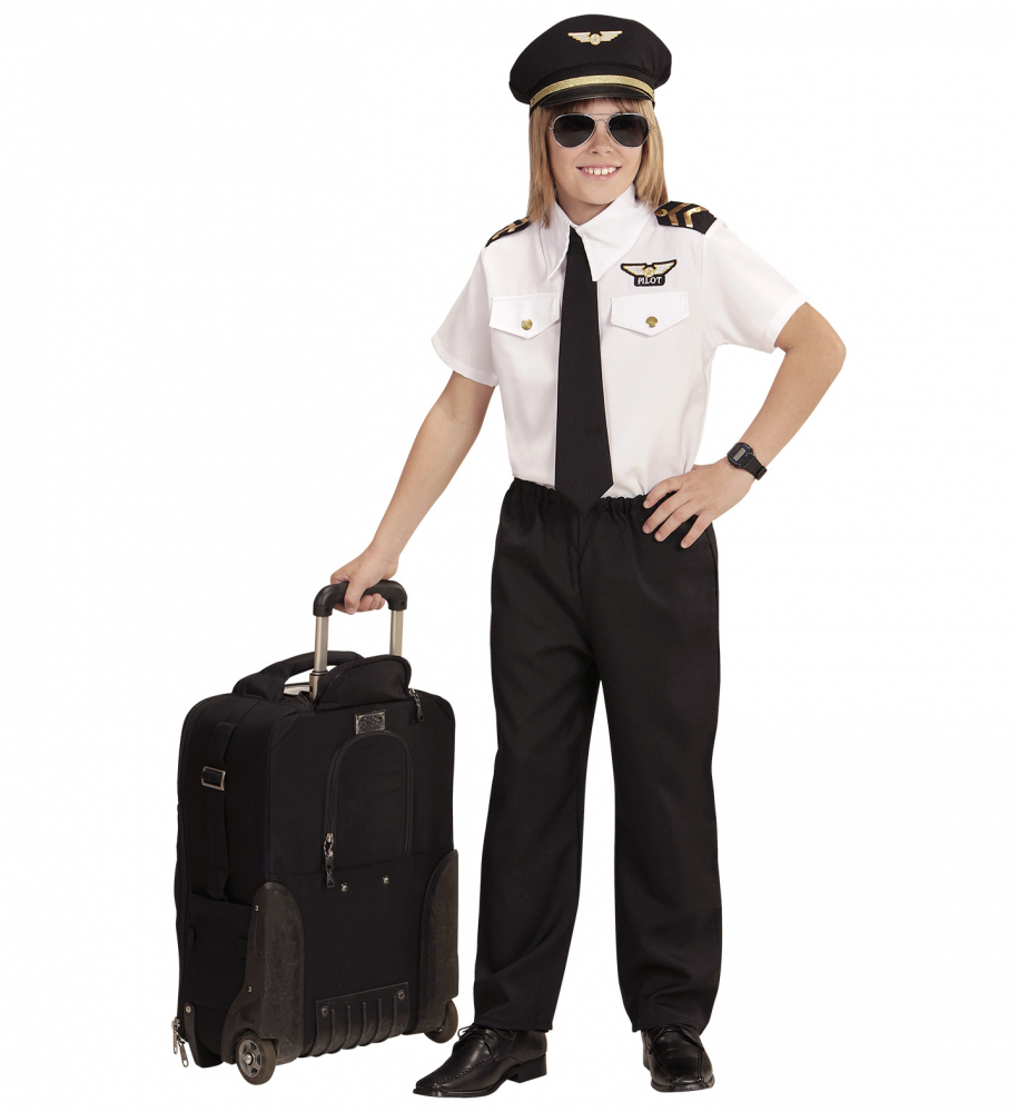 Costum Pilot Copii include camasa alba cu epoleti, pantalonii negri, cravata si sapca de pilot.