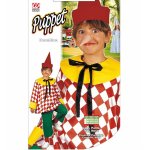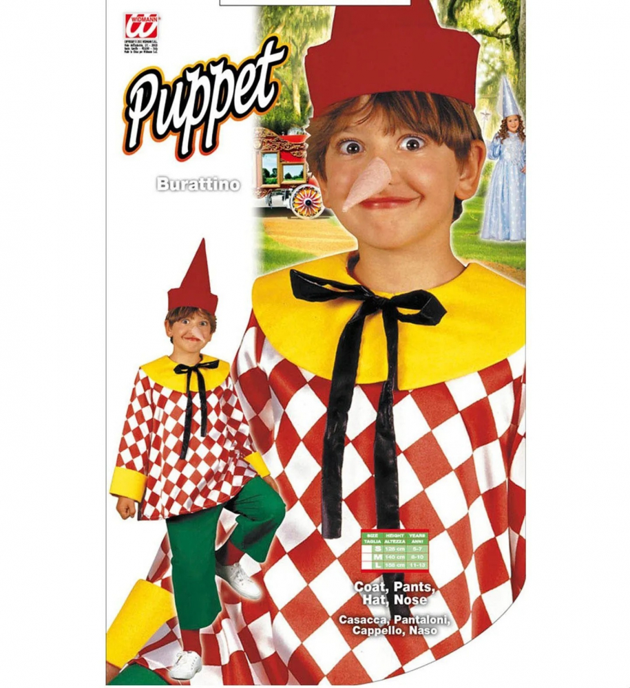 Costumul Pinochio include bluza, pantalonii, palaria si nasul.