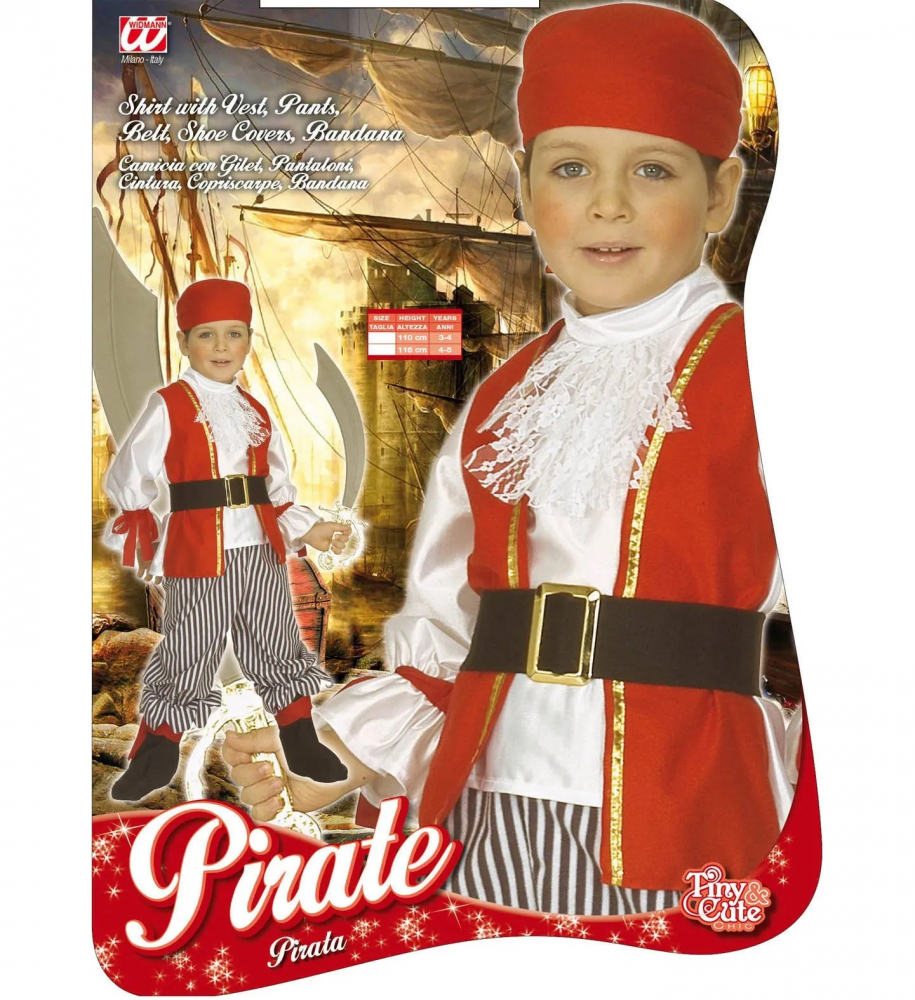 Costumul de pirat contine bluza, pantalonii, acoperitoarele pentru incaltaminte, centura si bandana.