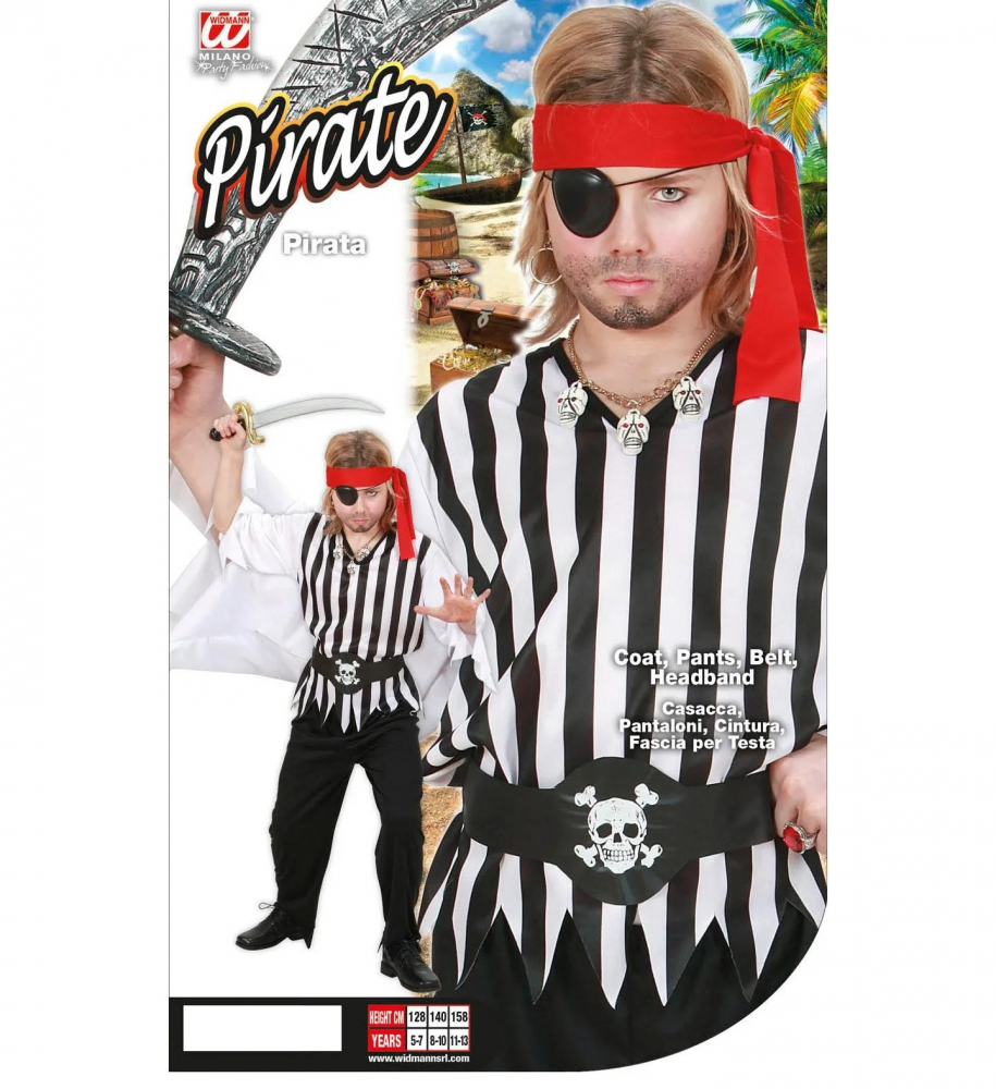 Costumul de pirat include pantalonii, bluza, centura si bandana.