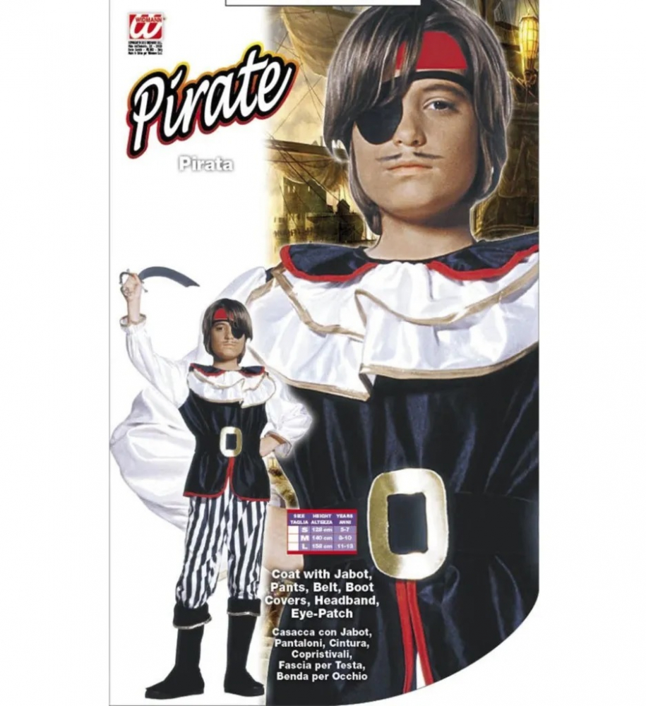 Costumul Pirat Nobil Copil include bluza cu jabou, pantaloni, centura, acoperitoare incaltaminte, bandana si eyepatch.