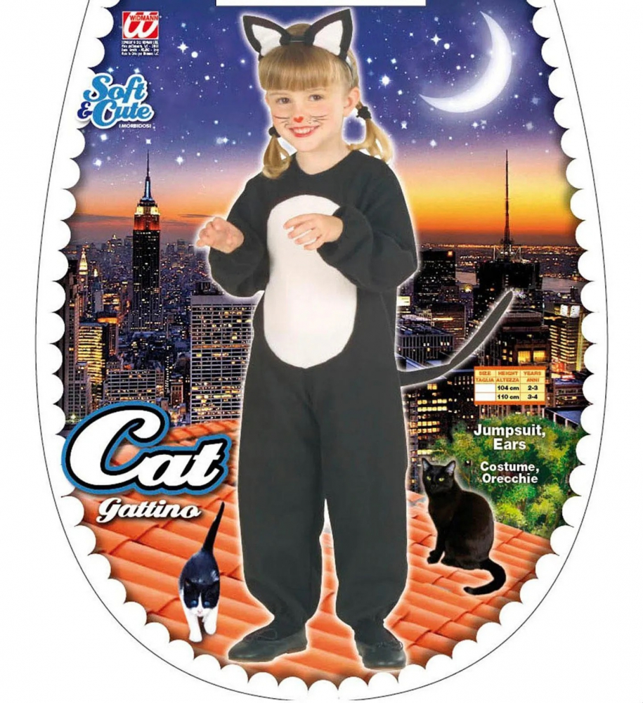 Costumul de pisica include salopeta cu coada aplicata si bentita cu urechiuse.