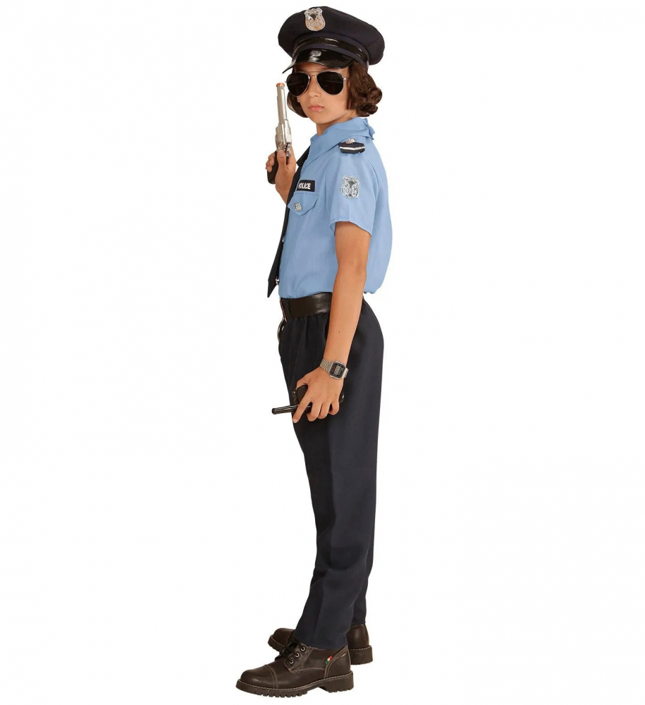 Costum Politist Baiat include camasa, pantalonii, cravata, centura si sapca. Costumul este disponibil pentru 2-3 ani (104 cm inaltime), 4-5 ani (116 cm inaltime), 5-7 ani (128 cm inaltime), 8-10 ani (140 cm inaltime) si 11-13 cm (158 cm inaltime). Costum Politist Baiat este o deghizare pentru toti baietii care isi doresc sa devina politisti atunci cand vor fi mari. Poate este doar o pasiune pentru aceast job din partea tatalui sau a unei rude, dar nu se stie niciodata ce va face cel mic peste cativa ani. Pentru asta noi iti propunem sa il initiezi un pic in ceea ce inseamna sa fii politist „cu acte-n regula”. In acest costum cel mic va avea alta postura si va trebui sa invete legile de infractiuni si contraventii, astfel incat sa aplice masura corecta prietenilor lui atunci cand se joaca cu masinutele, iar ceilalti incalca legea.