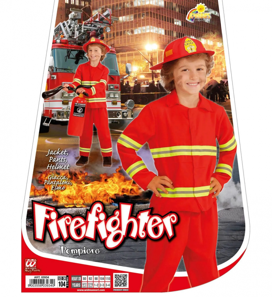 Costumul de pompier include jacheta, pantalonii si casca din burete. Aceasta deghizare este disponibila pentru 2-3 ani (inaltime 104 cm), 4-5 ani (inaltime 116 cm) si 5-7 ani (inaltime 128 cm).