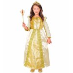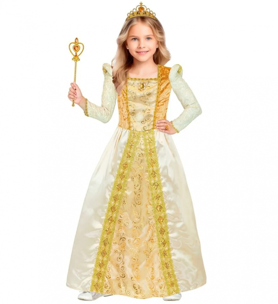 Costumul Printesa include rochia cu jupa, maneci lungi cu umeri inalti, bijuterie aurie in zona pieptului si coroana. Bagheta nu este inclusa.