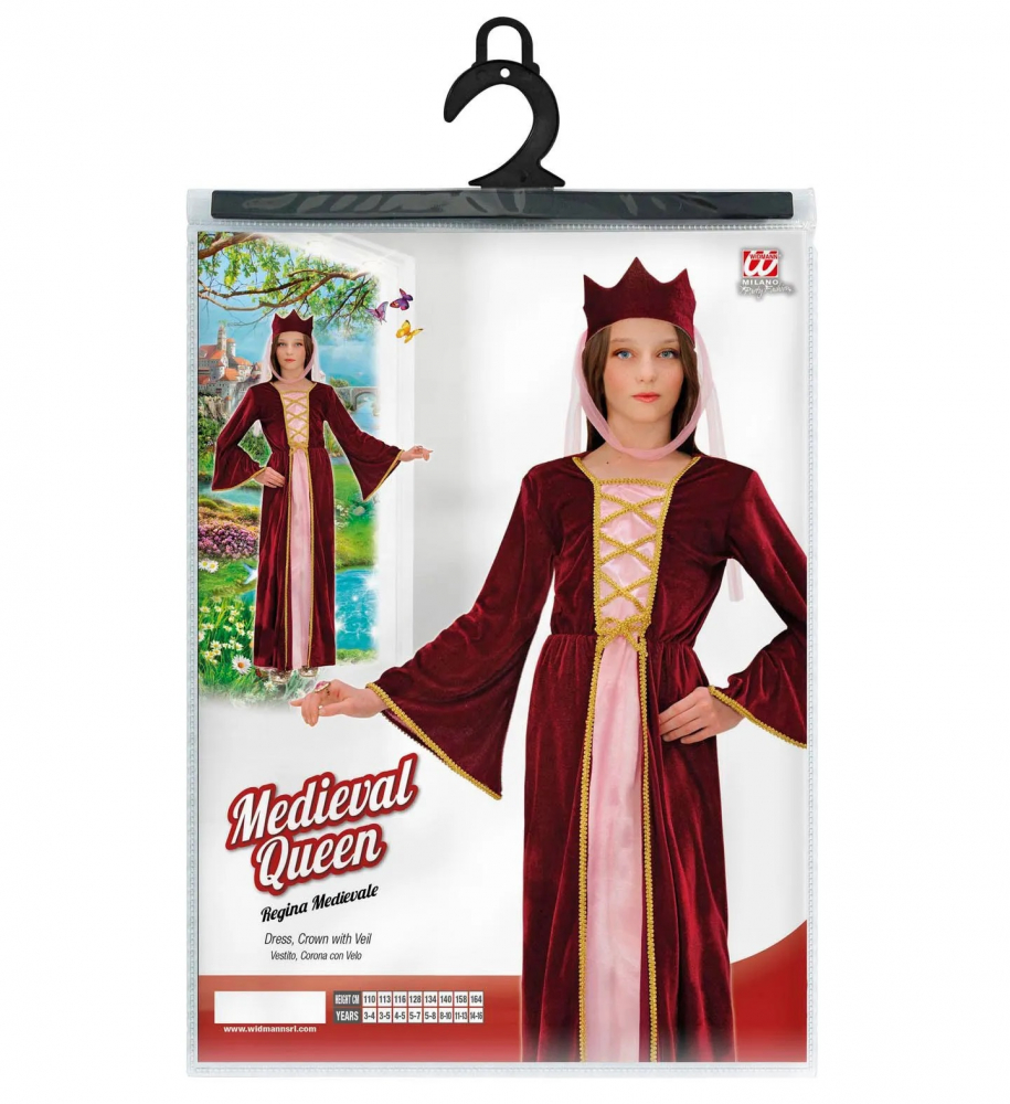Costumul Regina Medievala include rochia si coroana din material cu voal.