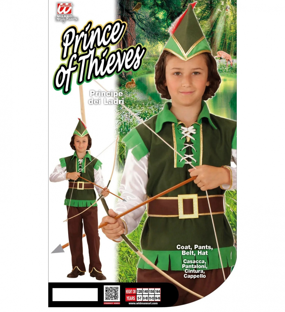 Costumul Robin Hood include bluza, pantalonii, centura si palaria asortata.