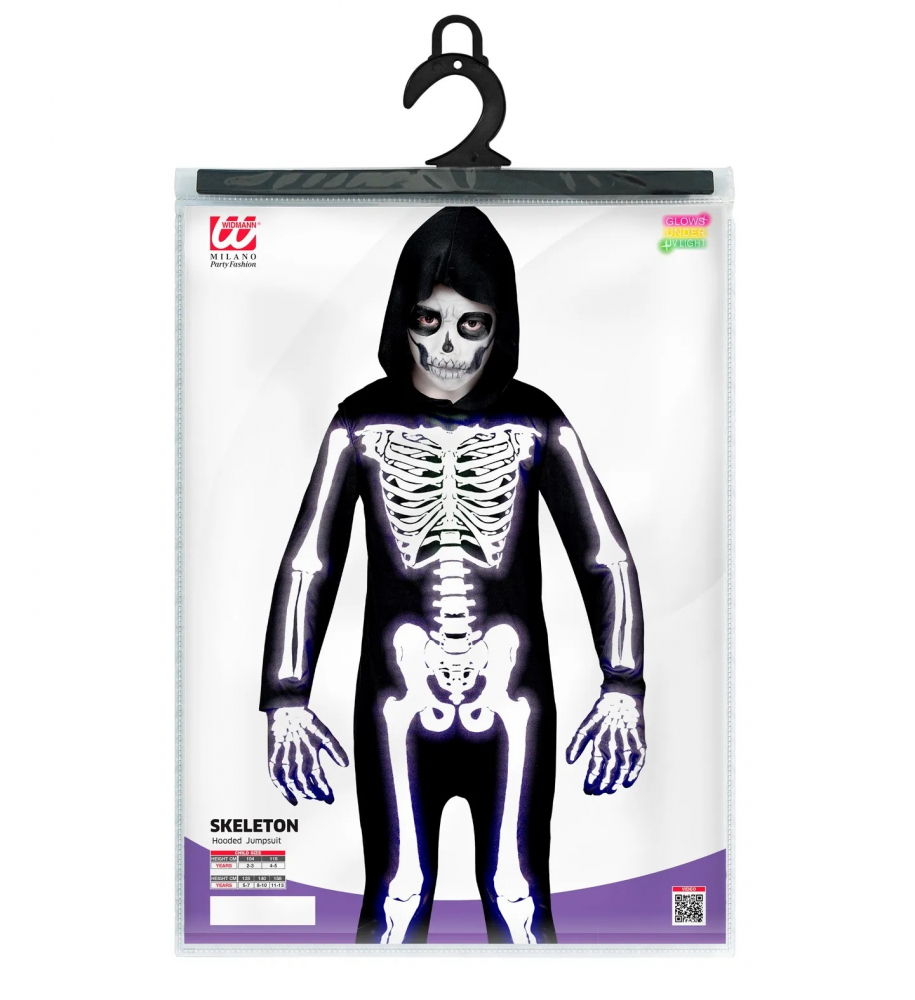 Costum Schelet Alb UV Copii include salopeta neagra cu imprimeu pe partea din fata ce straluceste in lumina UV si gluga aplicata.