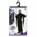 Costum Schelet Grim Reaper include roba neagra, centura din material si cagula cu masca.