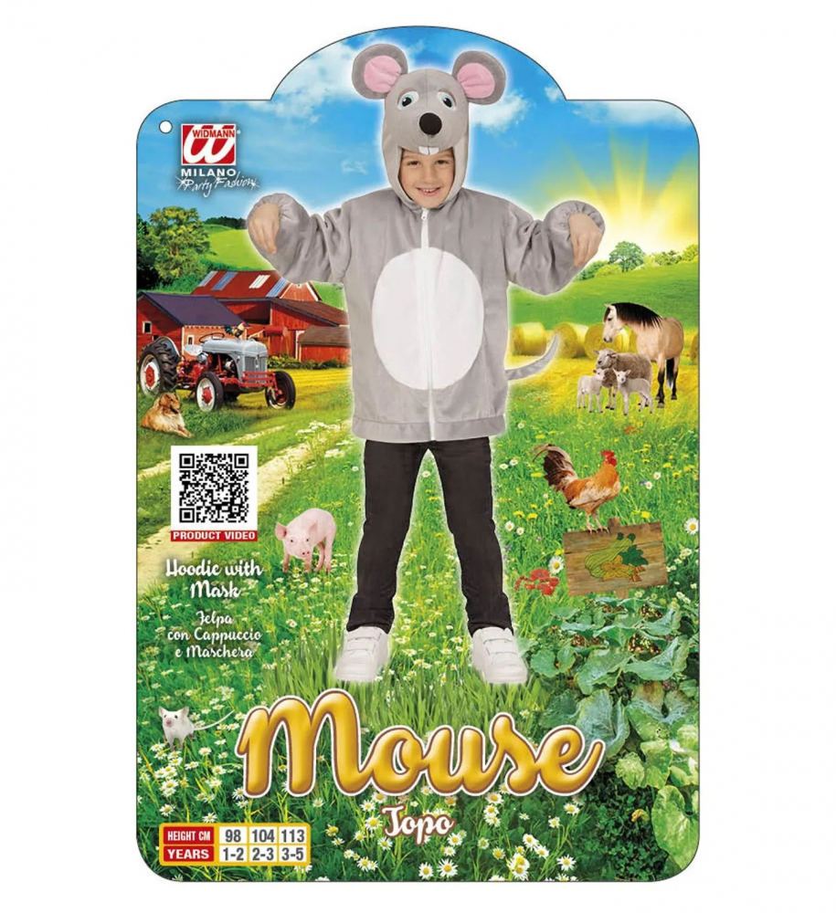 Costum Soricel Jacheta Copil include jacheta din plus moale, codita aplicata, gluga cu cap de soricel si se inchide prin fermoar. Jacheta de soarece este disponibila pentru copiii de 1-2 ani (98 cm inaltime), 2-3 ani (104 cm inaltime) si 3-5 ani (113 cm inaltime).