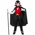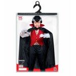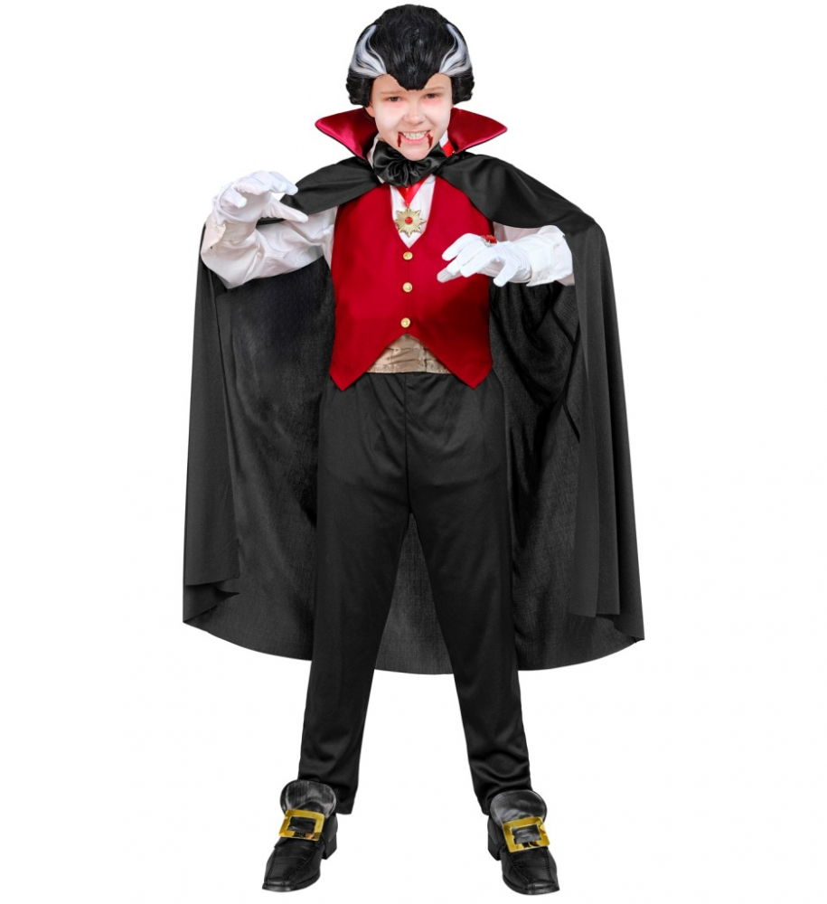 Costum Vampir Baieti 6 Piese include vesta rosie cu nasturi aurii aplicati, esarfa de pus in talie, papionul, medalion, manusile albe si pelerina.
