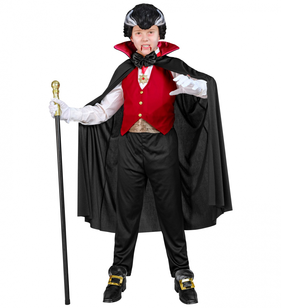 Costum Vampir Baieti 6 Piese include vesta rosie cu nasturi aurii aplicati, esarfa de pus in talie, papionul, medalion, manusile albe si pelerina.